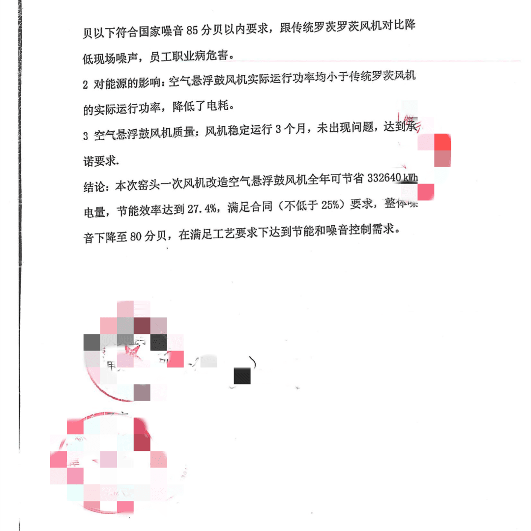 本次窯頭一次風機改造空氣懸浮鼓風機全年可節省332640kwh電量,節能效率達到27.4%,滿足合同(不低于25%)要求,整體噪音下降至80分貝,在滿足工藝要求下達到了節能和噪音控制需求。改造報告如下: