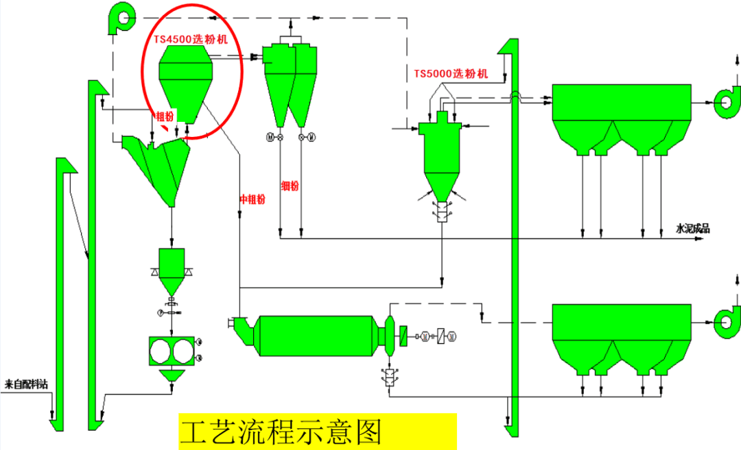 蘇州天山水泥生產工藝流程配置為4.2*13M管磨機+180*120輥壓機+TS4500雙轉籠選粉機,首先將各原材料按照一定配比通過電子皮帶秤計量混合后送至配料提升機,除鐵后進入循環提升機,提升至V型選粉機進行選粉,粗顆粒回恒重倉緩沖后進入輥壓機中碾壓,碾壓擠碎后通過循環提升機帶至V型選粉機,V型選粉機粗選出的較細物料進入TS4500選粉下轉籠初選,200um以上的顆粒通過下轉籠選粉后回恒重倉,小于200um的顆粒進入TS4500選粉機上轉籠再次進行選粉,合格品通過旋風筒收集送入成品斜槽與磨機成品進行混合,不合格品進入球磨機進行粉磨,球磨機粉磨后的物料通過出磨提升機提升至TS5000選粉機選粉,合格品通過系統風機帶入收塵系統收集后進入成品斜槽與TS4500成品混合,最終送入水泥庫作為水泥成品儲存,不合格品回球磨機進行再次粉磨。