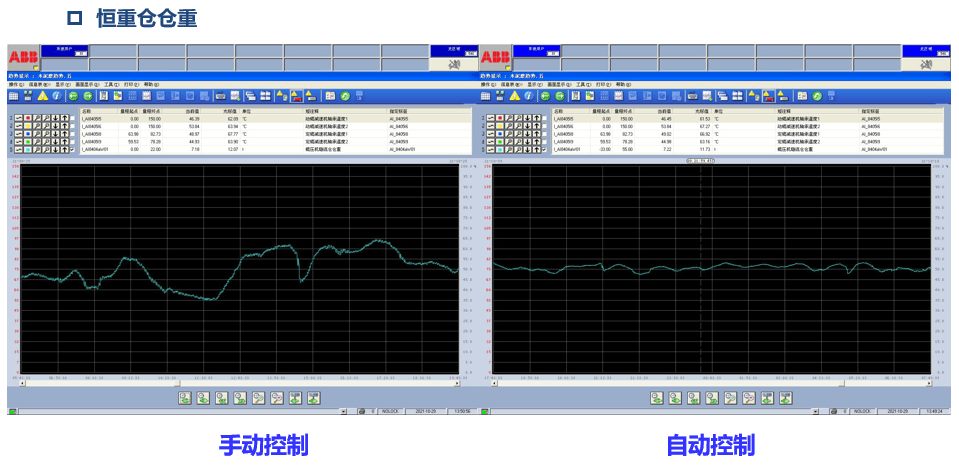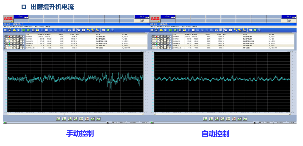 1、智能控制系統投運至今,實現自控率大于95%,輥壓機循環系統和磨機系統始終保持平衡穩定狀態,各參數波動幅度大幅度降低,水泥生產全智能、準無人化運行,可靠實現了生產過程的連續、平穩運行,下圖為恒重倉倉位和出磨提升機電流手動控制和自動控制趨勢對比圖。