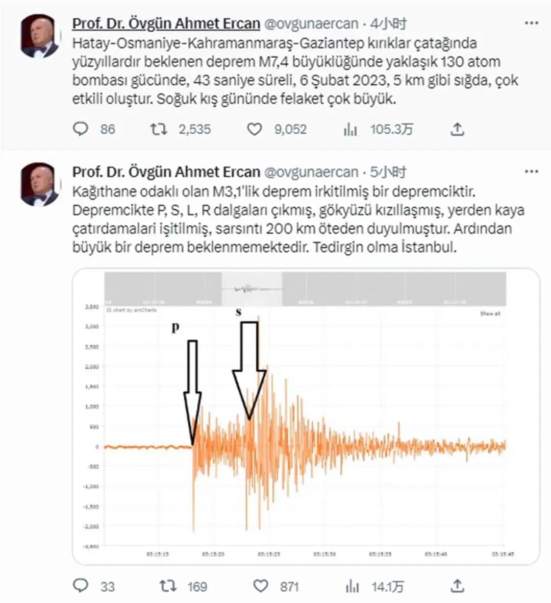 地震發(fā)生后,土耳其地震專家艾哈邁德·奧文·埃爾詹在推特上表示,地震發(fā)生的地方在四個主要斷裂帶的交界處,威力約為130顆原子彈持續(xù)爆炸了43秒。