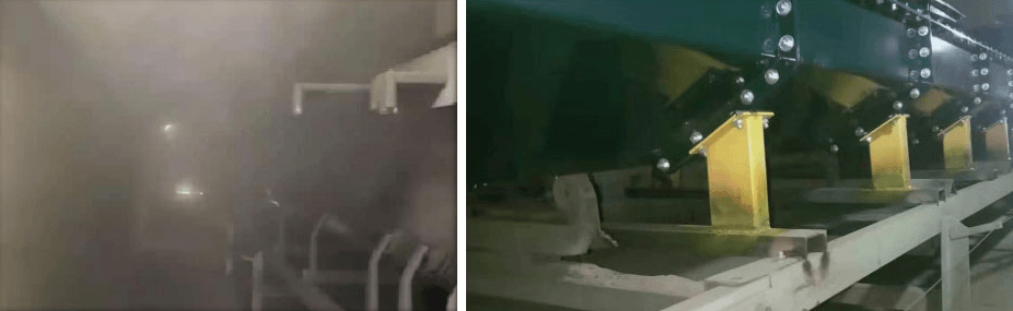 由于托輥與托輥之間有大于1米左右的間距,加之皮帶上裝載了物料,皮帶在運行的過程中如過山車,上下抖動,物料中的粉塵在交變力作用下脫離運送料流飛揚到空氣中形成污染。