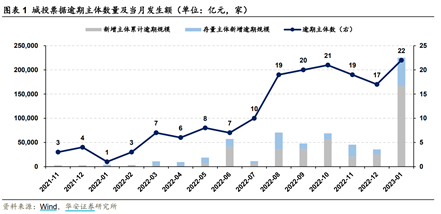 根據上海票交所2月10日公布名單,1月共1554家主體出現承兌人逾期現象,其中發債城投22家,較12月增加5家。主體類型方面,18家為新增主體,4家為存量主體;逾期規模方面,當月城投票據逾期發生額累計約22.5億元,環比大幅增加19.0億元,其中新增主體累計逾期發生額16.7億元,存量主體新增逾期發生額5.8億元。