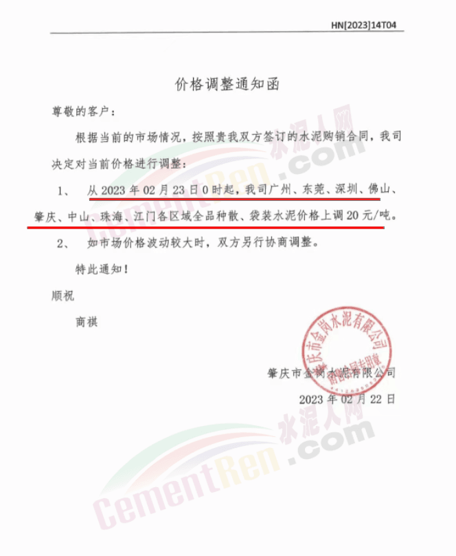肇慶金崗水泥通知,從2023年02月23日0時起,公司廣州、東莞、深圳、佛山肇慶、中山、珠海、江門各區域全品種散、袋裝水泥價格上調20 元/噸。