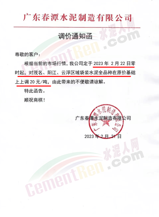 華潤水泥通知從2023年2月23日0時起,廣州、東莞、深圳、佛山、肇慶、中山、珠海、江門、惠州、湛江各區域全品種散、袋裝水泥價格上調20元/噸;陽江、茂名、云浮各區域全品種散裝水泥價格上調20元/噸;潮汕、揭尾銷售區域全品種散裝水泥價格上調20元/噸,全品種袋裝水泥價格上調10元/噸。