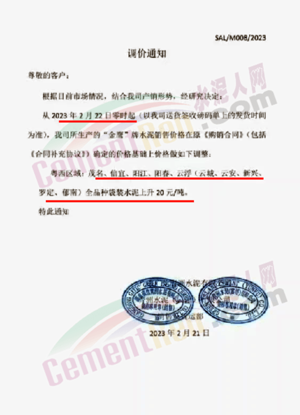 從2023年2月23日零時起所生產的“金鷹”牌水泥、熟料銷售價格在原《購銷合同)(包括《合同補充協議》)確定的價格基礎上價格做調整。粵西區域:茂名、信宜、陽江、陽春、云浮(云城、云安、新興、羅定、郁南)全品種散裝水泥上升20元/噸;除上述粵西域外其他區域全品種袋裝和散裝水泥上升20元/噸;全區域熟料上升10元/噸。