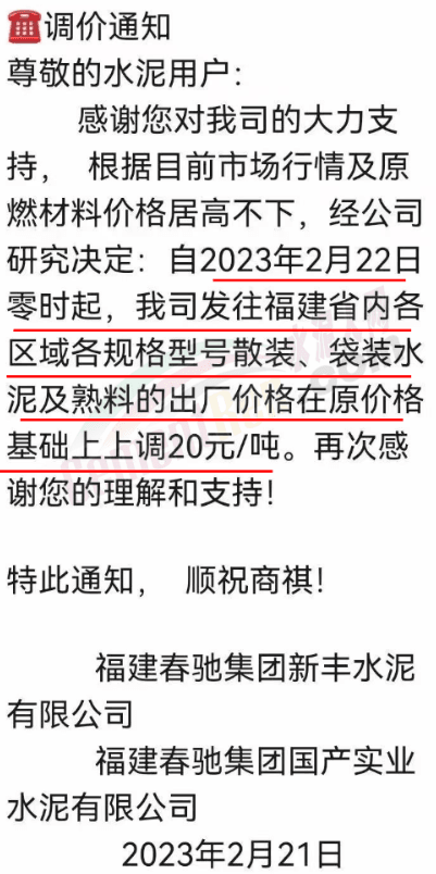 福建春馳通知2月22日零時起,發往福建省區域各規格水泥及熟料出廠價格上調20元/噸。