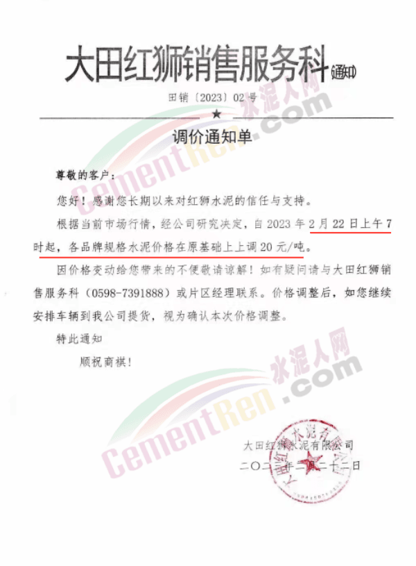 大田紅獅銷售服務科通知,2月22日上午7時起上調水泥價格20元/噸。