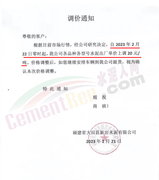 福建龍麟集團通知自2023年2月22日零時起,公司發往福建區域各規格型號袋裝、散裝水泥以及熟料,在原價格基礎上每噸上調20元/噸。