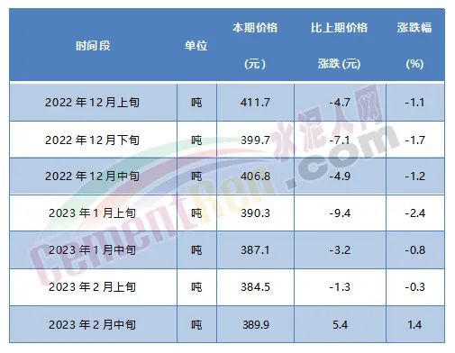P.O42.5散裝水泥不足400元/噸的報價,從上年12月下旬至今已經(jīng)持續(xù)了5個統(tǒng)計周期。且從2022年12月上旬起一直連續(xù)6個統(tǒng)計周期下跌,直至今年2月中旬才見反彈上行。