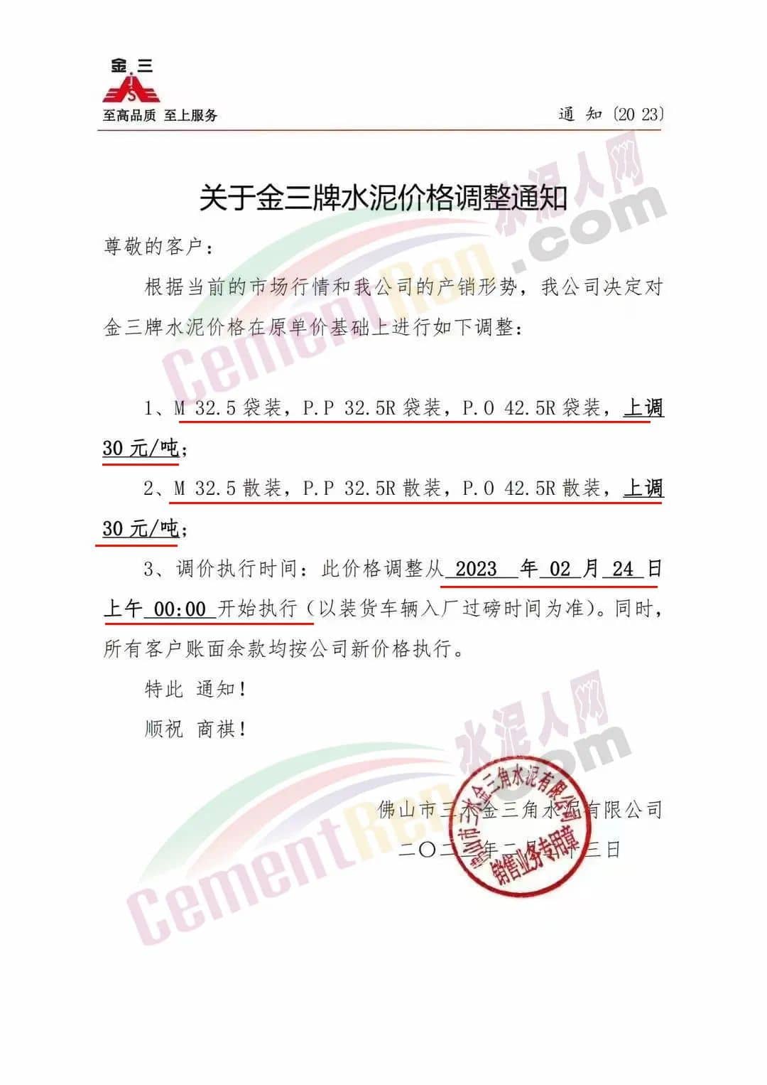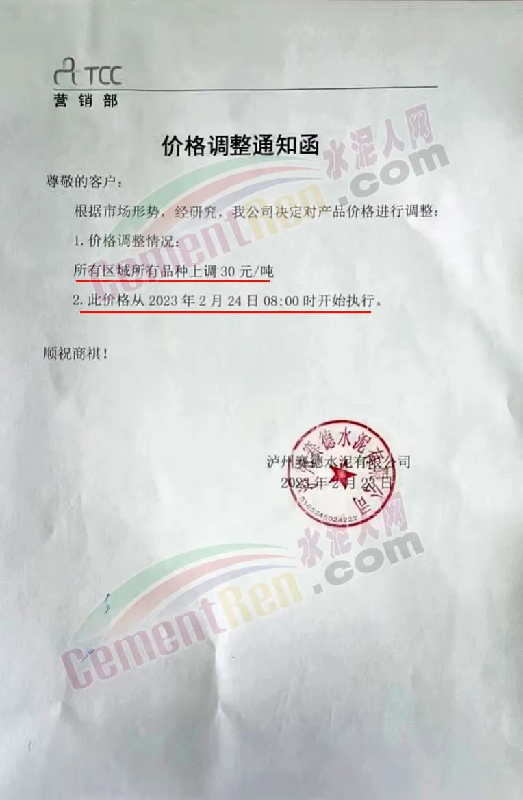 瀘州賽德水泥有聚公司通知從2023年2月24日8時開始,所有區(qū)域所有品種上調(diào)30元/噸。