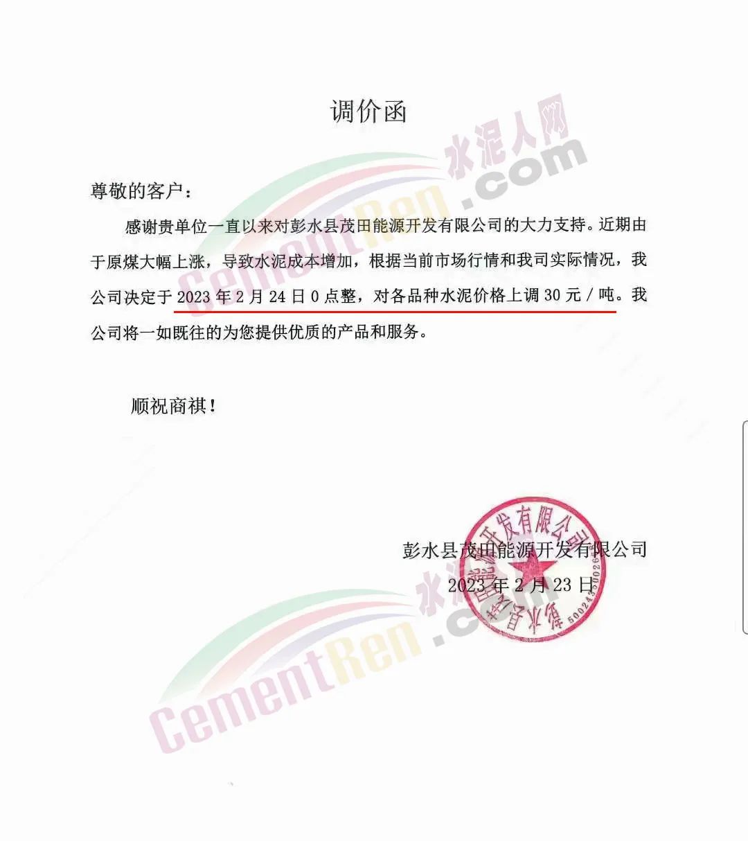 彭水縣茂田能源開發(fā)有限公司通知,近期由于原煤大幅上漲,導致水泥成本增加,根據(jù)當前市場行情和我司實際情況,定于2023年2月24日0點整,對各品種水泥價格上調(diào)30元/噸。