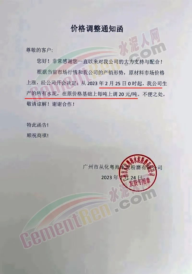 日前,廣州市從化粵海水泥粉磨有限公司通知,根據(jù)當前市場行情和公司的產(chǎn)銷形勢,原材料市場價格上漲,從2023 年2月25日0時起,公司生產(chǎn)的所有水泥,在原價格基礎(chǔ)上每噸上調(diào) 20 元/噸。