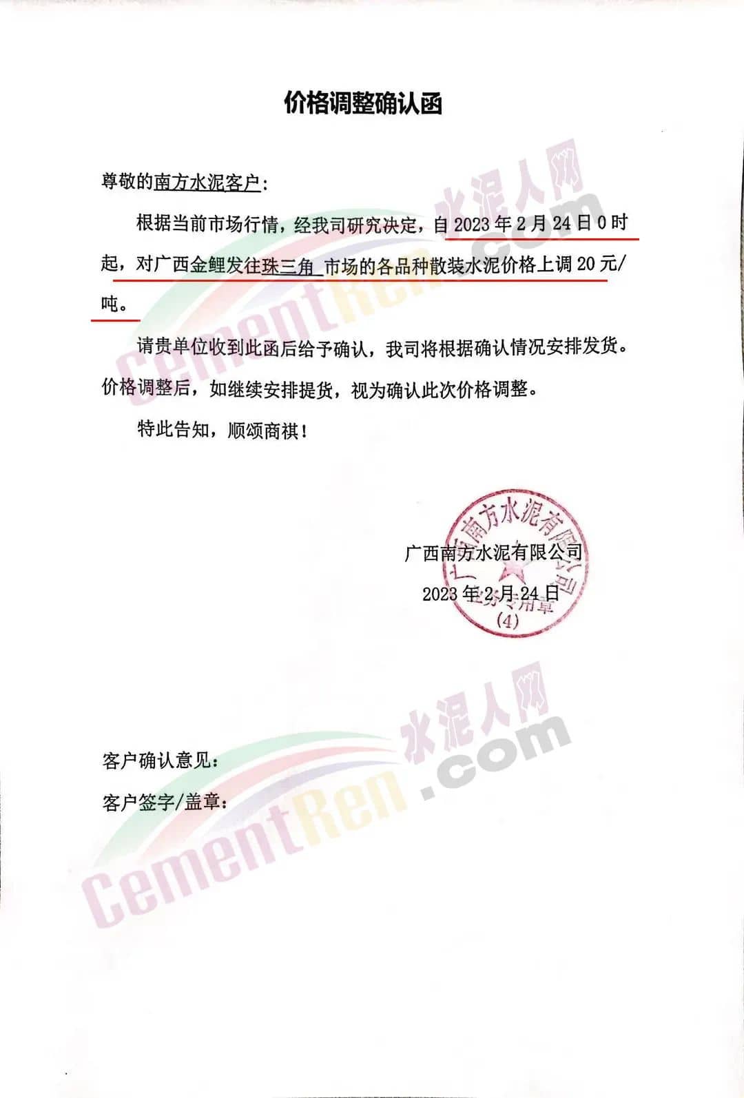 廣西南方水泥有限公司通知,經(jīng)公司研究決定,自2023年2月24日0時起,對廣西金鯉發(fā)往珠三角市場的各品種散裝水泥價格上調(diào)20元/噸。