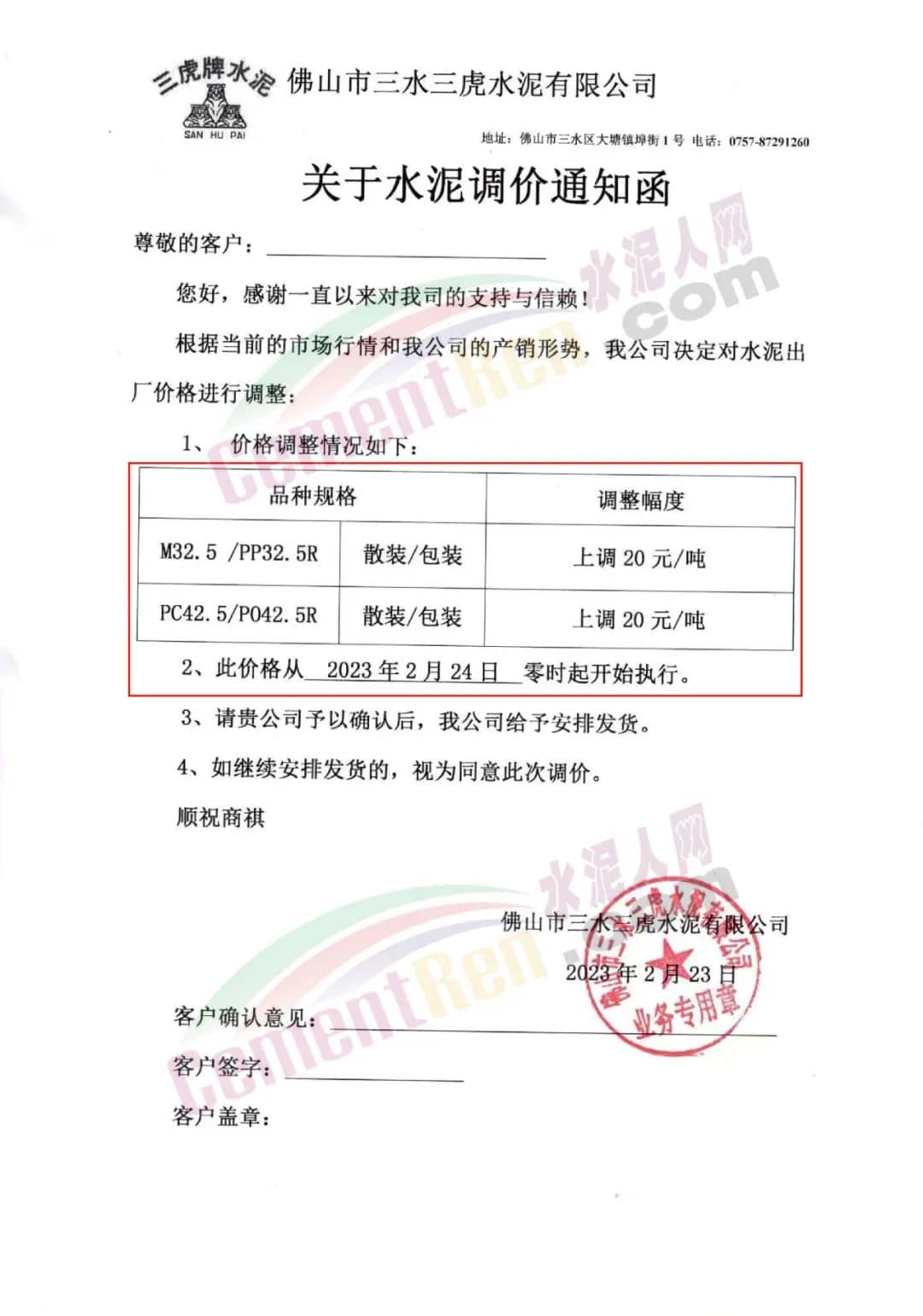 佛山市三水三虎水泥有限公司通知,自2月24日零時起,對各標號水泥出廠價格上調(diào)20元/噸。
