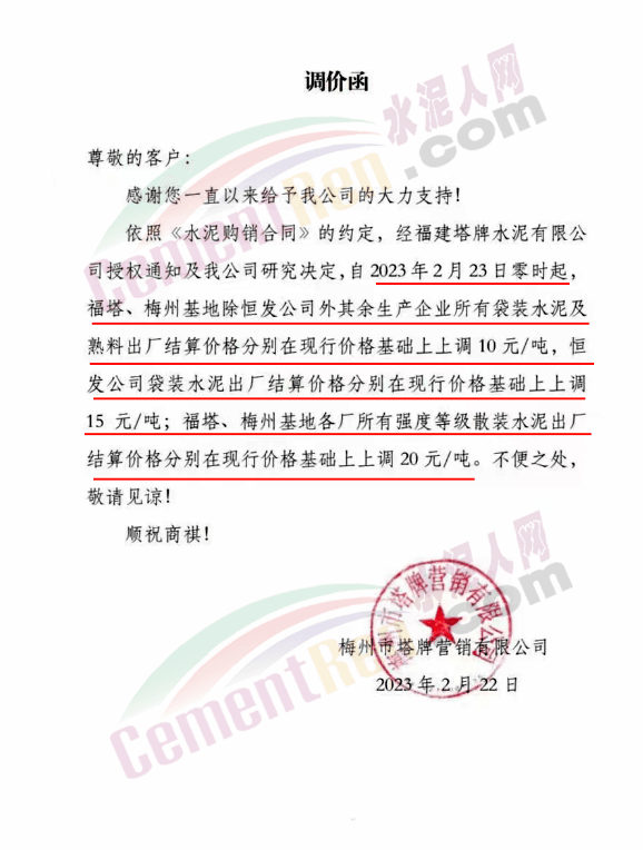 水泥人網通訊員消息,日前梅州市塔牌管銷有限公司通知,自2023年2月28日零時起,梅州基地金塔公司、恒塔公司所有袋裝PP325水泥結算價格分別在現行價格基礎上上調10元/噸;恒塔公司袋裝PP32.5R水泥結算價格在現行價格基礎上上調5元/噸;恒發公司所有水泥出廠結算價格分別在現行價格基礎上上調10元/噸。