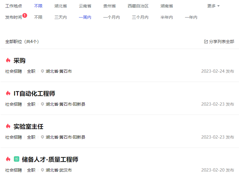 華新水泥一周內的社會招聘也僅有湖北黃石區域的采購、IT自動化工程師、實驗室主任以及長期招聘的儲備人才質量工程師。