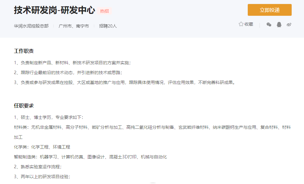 技術研發崗共招聘20人,任職要求碩士、博士學歷專業要求材料類:無機非金屬材料、高分子材料、巖礦分析與加工、高純二氧化硅分析與制備、玄武巖纖維材料、納米碳酸鈣生產與應用、復合材料、材料加工;化學類:化學工程、環境工程;智能制造類:機器學習、計算機仿真、圖像設計、混凝土3D打印、機械與自動化。并且要求熟悉實驗室運作流程和兩年以上的研發項目經驗。