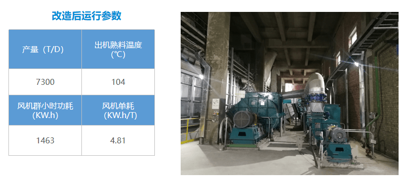 該企業(yè)裝備兩條日產5000噸規(guī)模的熟料生產線,2022年推進的A線改造廠家改選用沃亞機械的高效篦冷機冷卻風機,投入運行4個月時間,通過三方技術標定,本項目冷卻風機運行效率高(風機群整體運行效率>83.8%),冷卻電耗表現(xiàn)非常優(yōu)異,電耗明顯優(yōu)于同類項目,達到國內同類技改最佳水平。