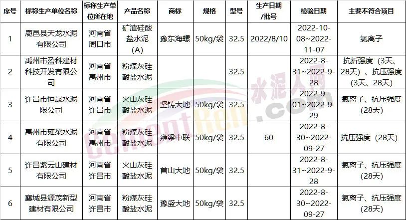 不合格品抽檢產(chǎn)品分別為礦渣硅酸鹽水泥(A)、粉煤灰硅酸鹽水泥、火山灰硅酸鹽水泥;標(biāo)稱單位分別為鹿邑縣天龍水泥有限公司、禹州市盈科建材科技開發(fā)有限公司、許昌市恒晟水泥有限公司、禹州市雍梁水泥有限公司、許昌紫云山建材有限公司、襄城縣源茂新型建材有限公司,主要不符合項目為氯離子、抗壓,抗折強(qiáng)度。不合格品商標(biāo)分別為豫東海螺、堅鑄大地、雍梁中聯(lián)、首山大地、豫盛大地。