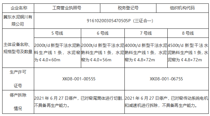 據了解,早在2021年9月26日銅川市人民政府就發布了《關于冀東水泥銅川有限公司5、6、7、8號 生產線停產拆除的公告》公告提到,經實地核查,冀東水泥銅川有限公司新建的萬噸水泥熟料生產線已于2021年6月28日點火投產,該公司產能置換后5、6號生產線2021年6月27日停產,已對窯尾筒體進行切割,不具備再生產能力。7、8號生產線2021年6月27日停產,已對窯傳動系統電機和減速機進行拆除,不具備再生產能力。