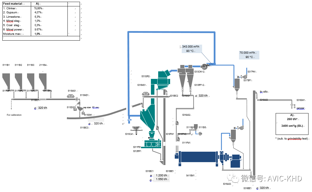 新建輥壓機閉路系統(tǒng)(布置在現(xiàn)有水泥車間外的臨近空地處):新購置主機設備包括輥壓機(KHD)、V型靜態(tài)選粉機(KHD)、高效動態(tài)選粉機(KHD)、高效低壓損旋風筒(KHD)、循環(huán)風機、袋收塵器及風機等。