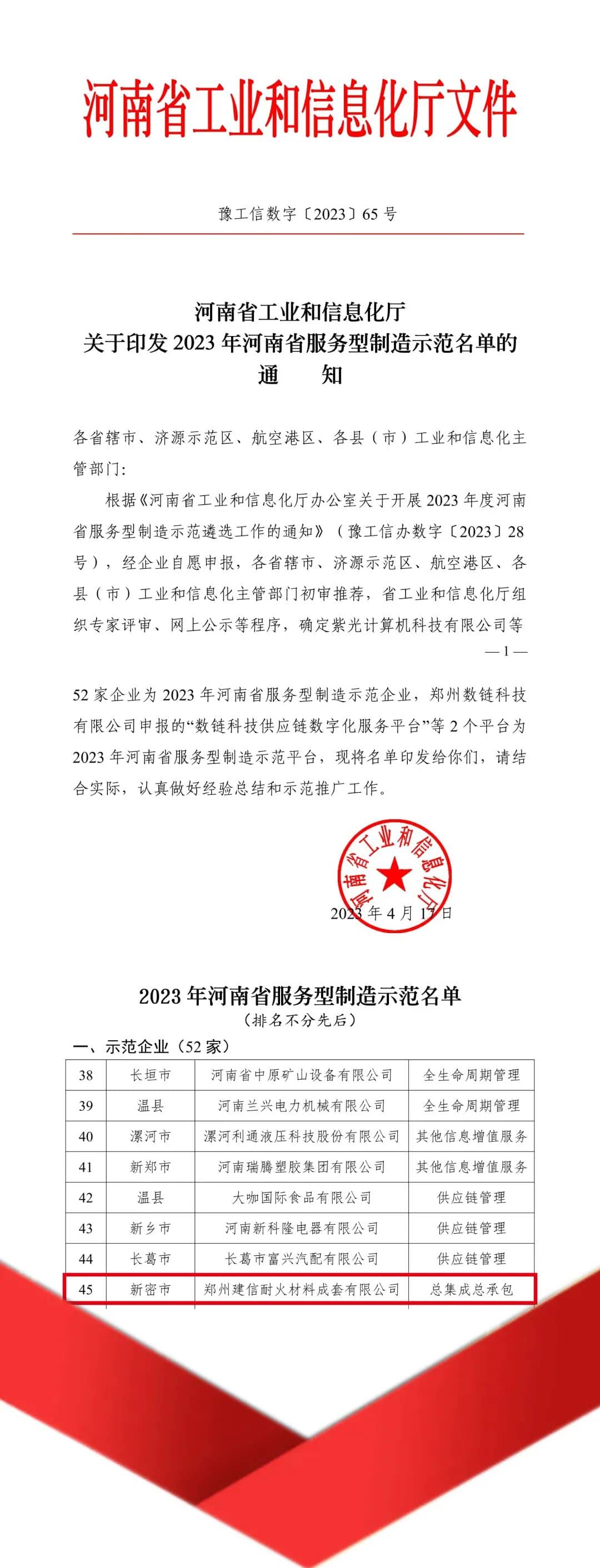 近日,河南省工業和信息化廳公布了“2023年服務型制造示范企業”獲批名單,公司被認定為“總集成總承包”領域服務型制造示范企業。服務型制造是制造與服務融合發展的新型模式和產業形態,既是先進制造業和現代服務深度融合的重要方向,也是近年來國家大力推動企業生產經營重心從制造環節向制造和服務并重的巨大轉變。