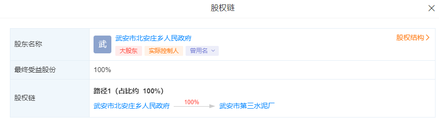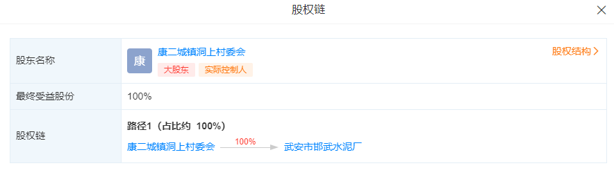 據查詢,武安市邯武水泥廠法定代表人王騰,工商注冊地址為河北省邯鄲市武安市康二城鎮洞上村東。股權鏈信息顯示,其大股東為康二城鎮洞上村委會。
