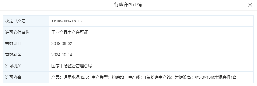 企業生產許可證編號XK08-001-03816,有效期至2024年10月14日。企業類型為粉磨站,擁有1條粉磨生產線,關鍵設備Φ3.8×13m水泥磨機1臺。