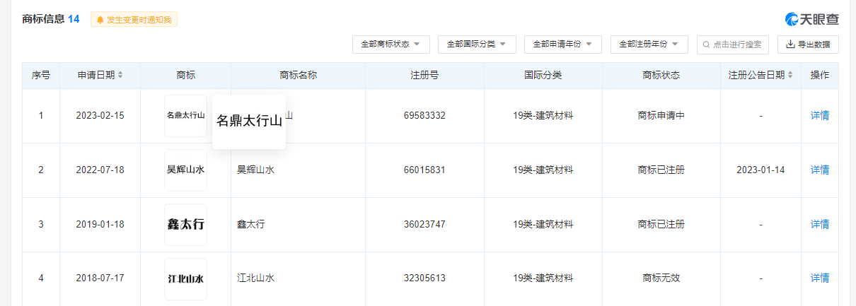 水泥人網注意到,企業旗下與國內知名商標類似的有“昊輝山水、鑫太行”目前狀態為已注冊狀態,“江北山水”商標為無效狀態。