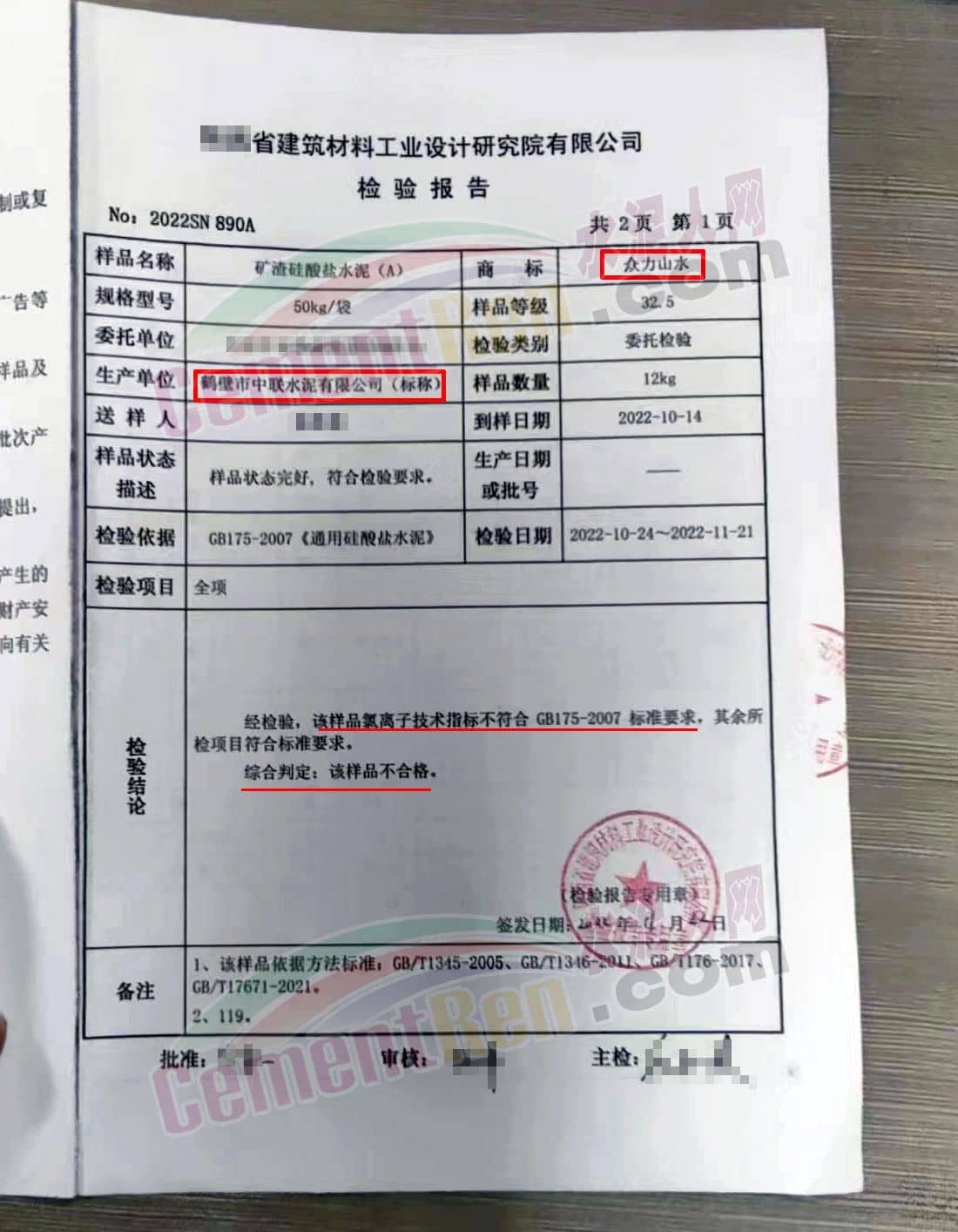 據水泥質量萬里行組委會反饋,在抽檢的不合格水泥中,包括標稱生產單位為鶴壁市中聯水泥有限公司(以下簡稱“鶴壁市中聯水泥”該企業非中國建材集團旗下企業)旗下的“眾力山水”和標稱為“鶴壁中聯”牌的兩個批次P.S.A32.5礦渣硅酸鹽水泥樣品委托檢驗報告檢驗結論均為“氯離子技術指標不符合GB175-2007標準要求,綜合判定為該樣品不合格”。