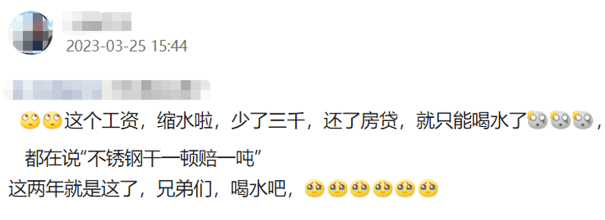 這個工資縮水了,少了3000,還了房貸,就只能喝水了。都在說‘不銹鋼干一噸賠一噸’……”。