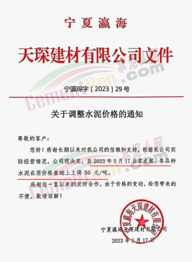 寧夏瀛海天琛建材有限公司通知,根據公司實際經營情況,現決定,自2023年5月17日零點起,各品種水泥在原價格基礎上上調50元/噸。