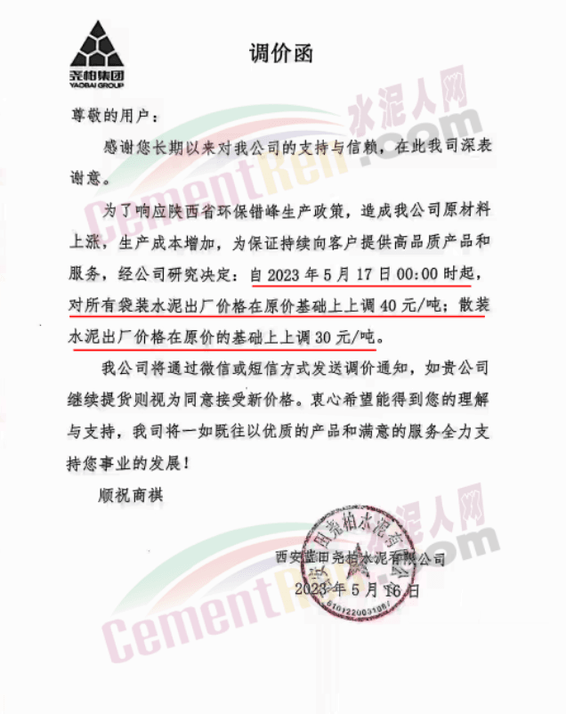 同日,蒲城堯柏特種水泥有限公司通知,為了響應夏季錯峰生產政策,造成公司原材料上漲,生產成本增加,為保證持續向客戶提供高品質產品和服務。經公司研究決定:自5月17日0時起,對所有袋裝水泥出廠價格在原價基礎上上調40元/噸;散裝水泥出廠價格在原價基礎上上調30元/噸。