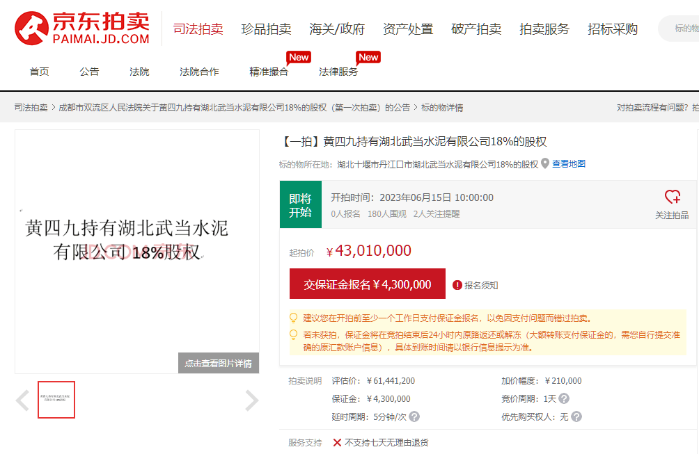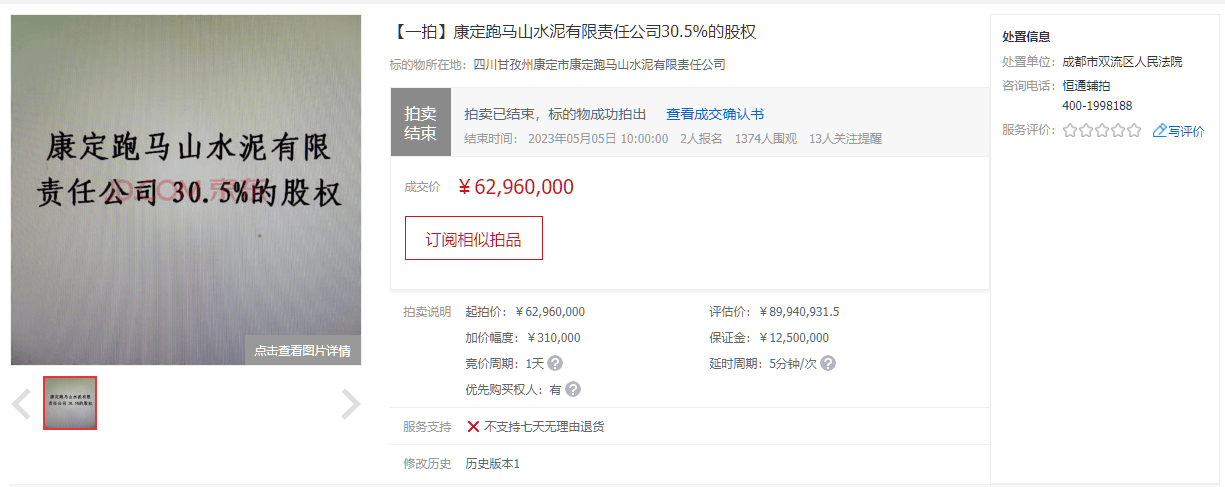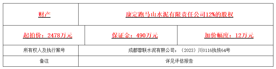 3月29日,成都市雙流區(qū)人民法院發(fā)布拍賣(mài)公告(川0116執(zhí)恢64號(hào))提到定于5月4日10時(shí)至5月5日10時(shí)在京東網(wǎng)司法拍賣(mài)網(wǎng)絡(luò)平臺(tái)公開(kāi)拍賣(mài)涉案財(cái)產(chǎn)。拍賣(mài)財(cái)產(chǎn)為康定跑馬山水泥有限責(zé)任公司12%的股權(quán),起拍價(jià)2478萬(wàn)元。