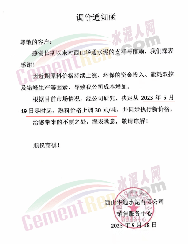 西山華通水泥有限公司通知因近期原料價格持續上漲、環保的資金投入、能耗雙控及錯峰生產等因素,導致公司成本增加。根據目前市場情況,經公司研究,決定從年5月19日零時起熟料價格上調30元/噸。