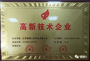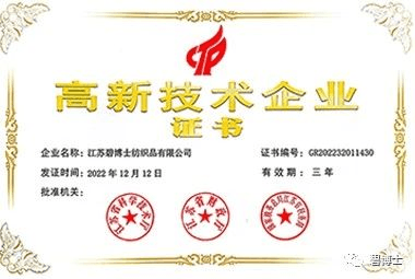 近日,江蘇碧博士紡織品有限公司(以下簡稱“碧博士”)成功獲得國家“高新技術企業”認定殊榮,正式邁入國家高新技術企業行列。本次成功入選高新技術企業,是國家相關部門對碧博士多年來工作的肯定,也是碧博士產品研發實力與創新能力的體現。