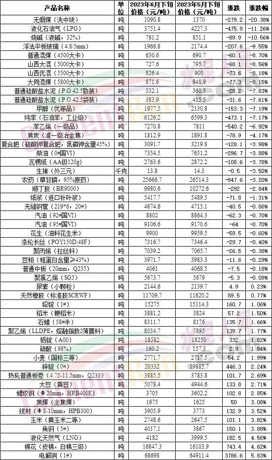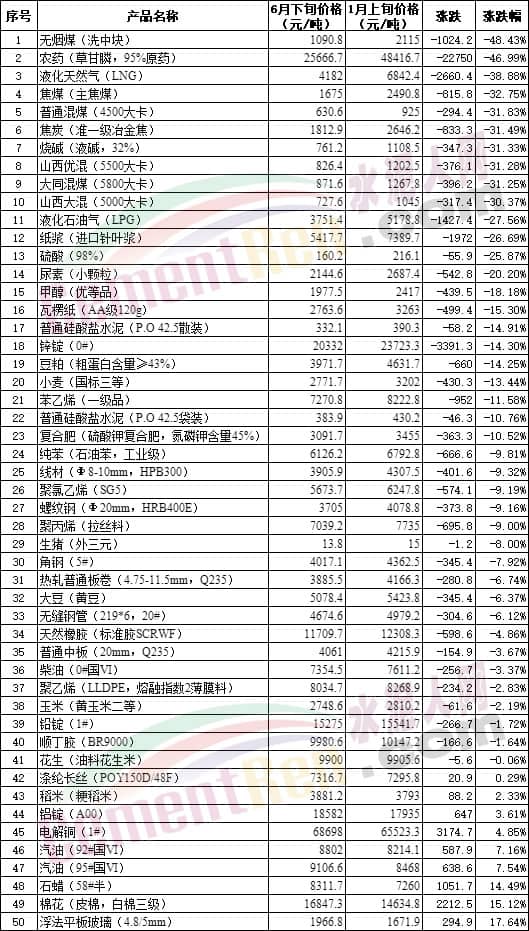 環比5月下旬,50種生產物資中有30種下跌,其中包含煤炭、液化石油氣、水泥、柴油及多種化工品,另外柴油、汽油價格也處于下跌列表中。