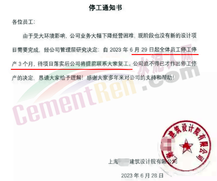 日前,上海某甲級設計院因為沒有業(yè)務不得不宣告全體員工停工停產(chǎn)。企業(yè)通知書稱,由于受大環(huán)境影響,公司業(yè)務大幅下降經(jīng)營困難,現(xiàn)階段也沒有新的設計項目需要完成。經(jīng)公司管理層研究決定,自2023 年6月29 日起全體員工停工停產(chǎn)3個月,待項目落實后公司將提前聯(lián)系大家復工。公司迫不得已才作出停工停產(chǎn)的決定。