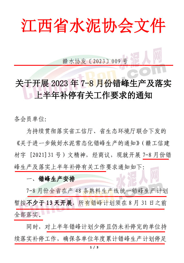 日前,江西省水泥協(xié)會通知全省在產(chǎn) 48 條熟料生產(chǎn)線將在7-8 月份統(tǒng)一錯峰生產(chǎn)13天以上,通知文件提到,當前,受房地產(chǎn)等影響行業(yè)需求相對疲軟,錯峰生產(chǎn)作為國家產(chǎn)業(yè)政策,是目前行業(yè)解決產(chǎn)能過剩矛盾的不二選擇,大企業(yè)要高度共識、帶頭引領、強化自律意識,進一步增強責任感,從“要我錯峰”向“我要錯峰”轉變切實將錯峰生產(chǎn)落實好。