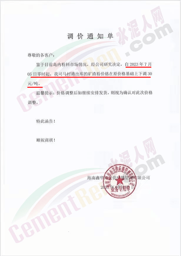 “天涯‘牌水泥通知,自2023年7月8日零時(shí)起所有品種水泥在出廠價(jià)格基礎(chǔ)上上調(diào)30元/噸,同期調(diào)整粉煤灰及礦渣粉報(bào)價(jià)。