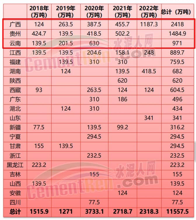 據水泥人網信息中心數據,近五年來,全國新增水泥熟料總產能11557.5萬噸,投產時間主要集中在2020~2022年。從各地區的新增分布情況來看,排名靠前的是廣西、貴州、云南三個區域。