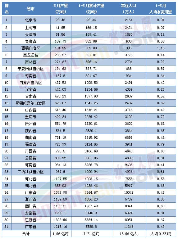 從分省市數據來看,前5月,廣東以產量5588.8萬噸位列第一,同比增長0.68%;江蘇產量5384.14萬噸排在第二,同比增長4.76%;安徽產量5146.9萬噸排在第三,同比下降1.15%。除西藏自治區人均水泥產量在1噸以上外,其他30個省市自治區人均產量均不足1噸。