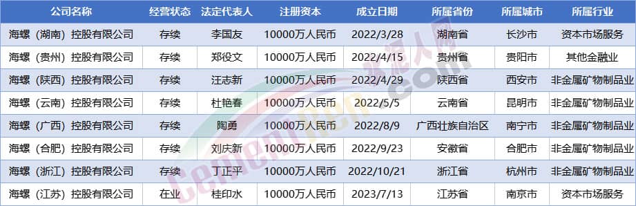 據查詢,近兩年,海螺水泥先后成立7家區域控股有限公司,注冊資本均為1億元。涉及湖南、貴州、陜西、云南、廣西、安徽、浙江等多個省市地區,所屬行業分別為資本市場服務及非金屬礦物制品業。