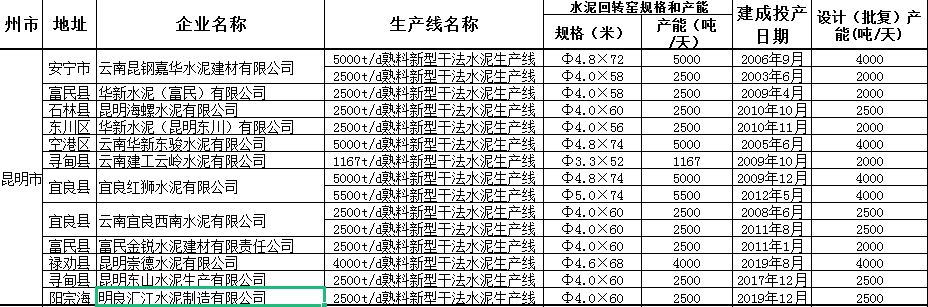 昆明地區水泥熟料企業數據(來自云南省工信廳)