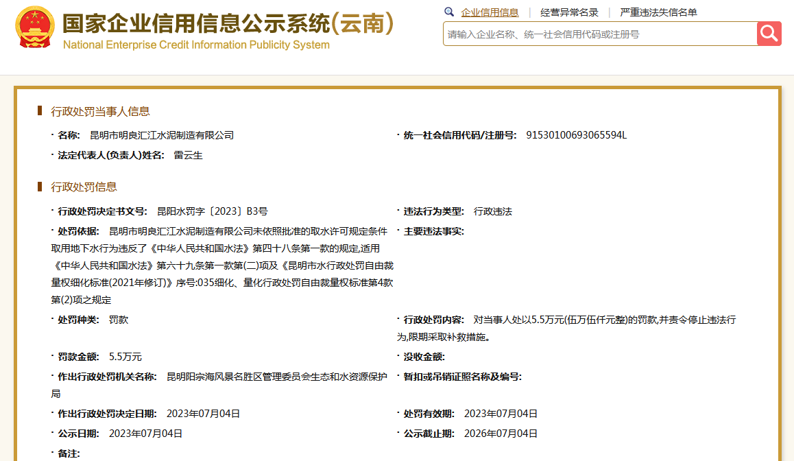 另外,根據國家企業信用信息公示系統公開信息顯示,昆明市明良匯江水泥制造有限公司未依照批準的取水許可規定條件取用地下水,被昆明陽宗海風景名勝區管理委員會生態和水資源保護局處罰。