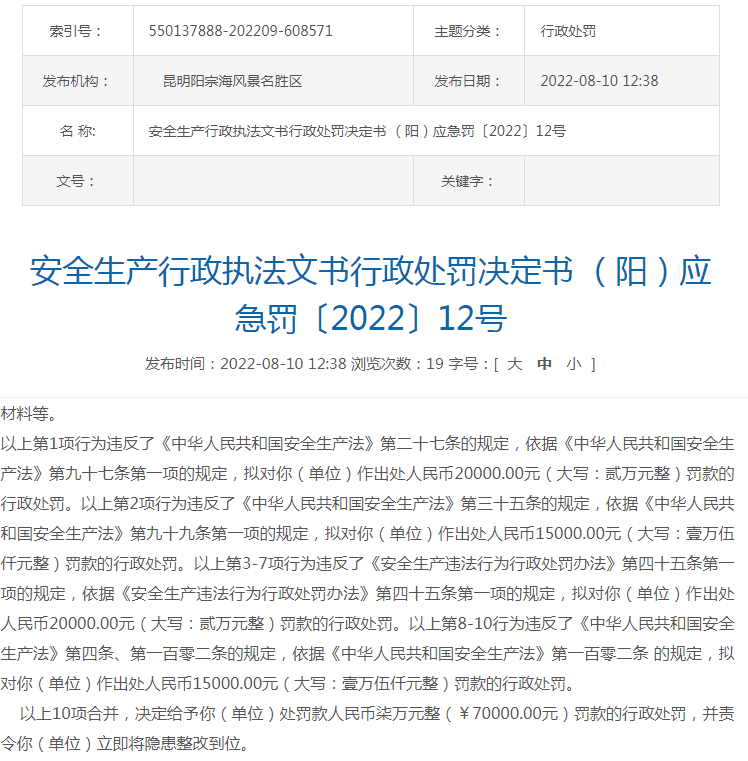 2022年8月10日,昆明陽宗海風景名勝區管理委員會發布《安全生產行政執法文書行政處罰決定書(陽)應急罰〔2022〕12號》稱:昆明市明良匯江水泥制造有限公司大馬山石灰巖礦在生產過程中存在未配備注冊安全工程師、采礦技術員,礦山+1980m水平臺階存在凹陷,該區域未設置警示標識,礦山未編制挖掘機、裝載機、推土機操作規程等違法違規行為,昆明陽宗海風景名勝區管理委員會對該水泥廠作出7萬元處罰。