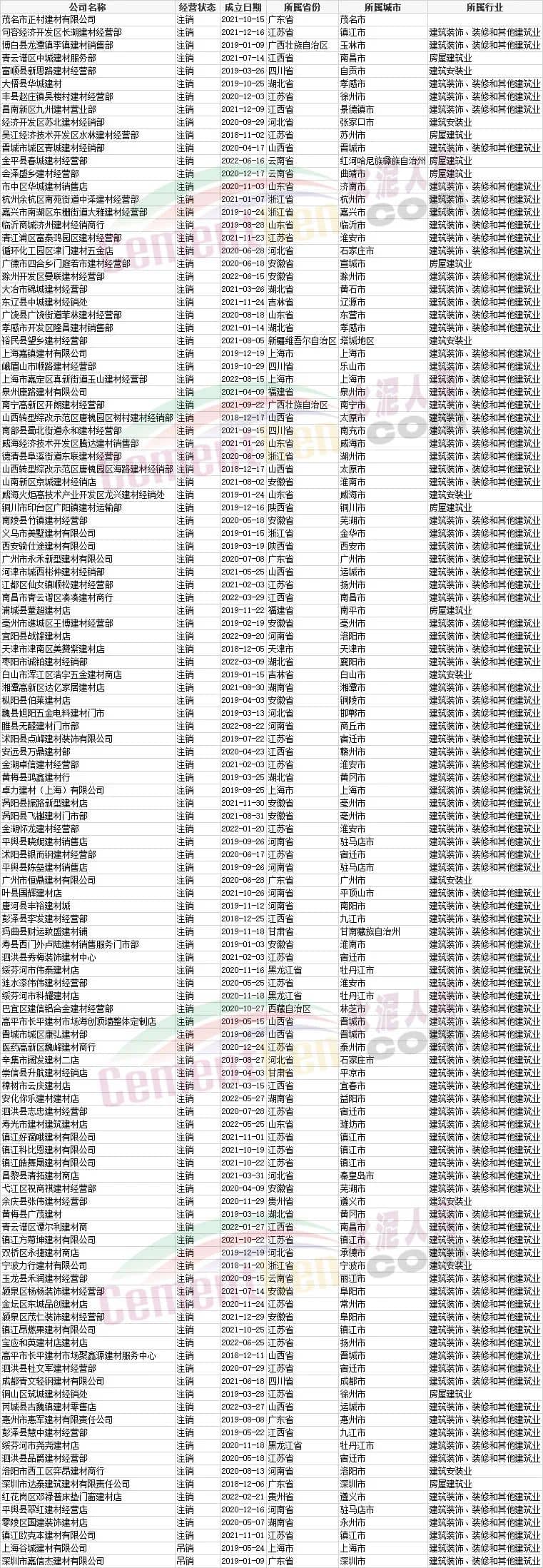 近5年成立,名稱中有“建材”字樣,所屬行業為房屋建筑業、建筑安裝業建筑裝飾、裝修和其他建筑業的,目前狀態是吊銷、注銷的企業共122家。