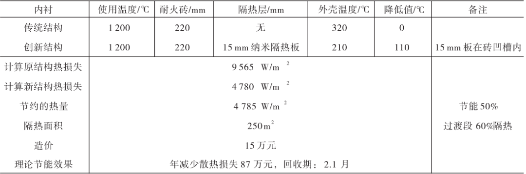 采用納米隔熱板替換原硅酸鈣板一段時間后發現,C5旋風筒散熱損失減少336W/m2,外殼溫度下降21℃,熱損失減少43%,加強耐火襯的隔熱效果。