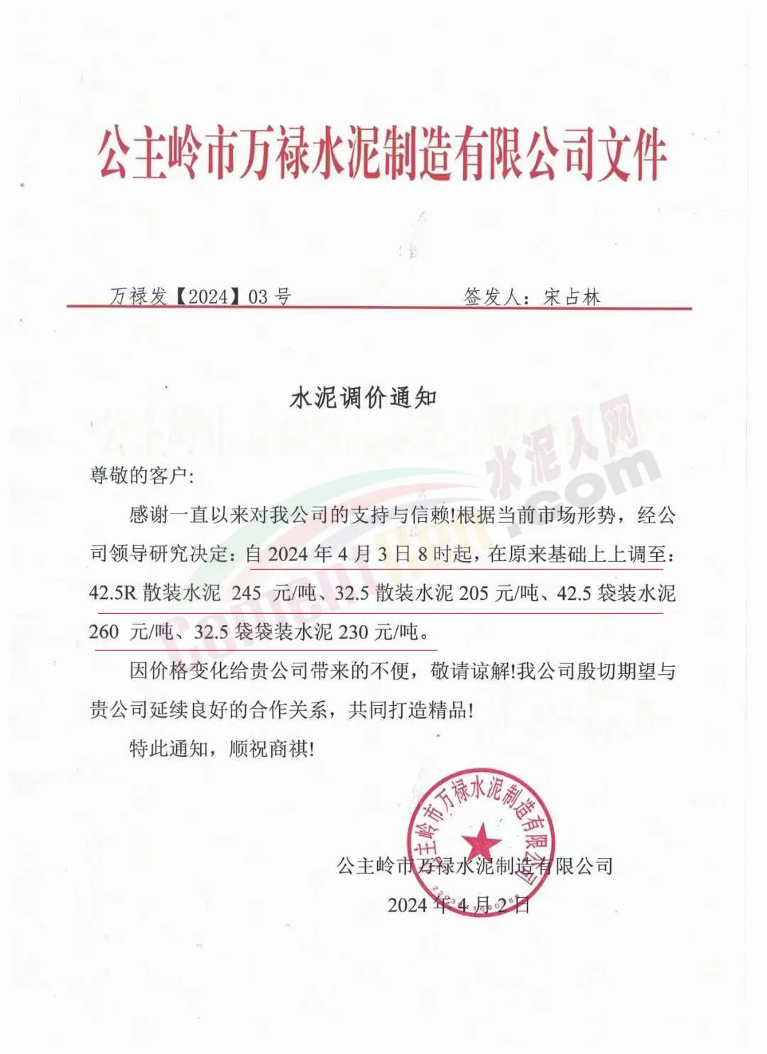 公主嶺市萬祿水泥通知,根據當前市場形勢,經公司領導研究決定,自2024年4月3日8時起,在原來基礎上上調至,42.5R散裝水泥245元/噸、32.5散裝水泥205元/噸、42.5袋裝水泥260元/噸、32.5袋袋裝水泥230元/噸。