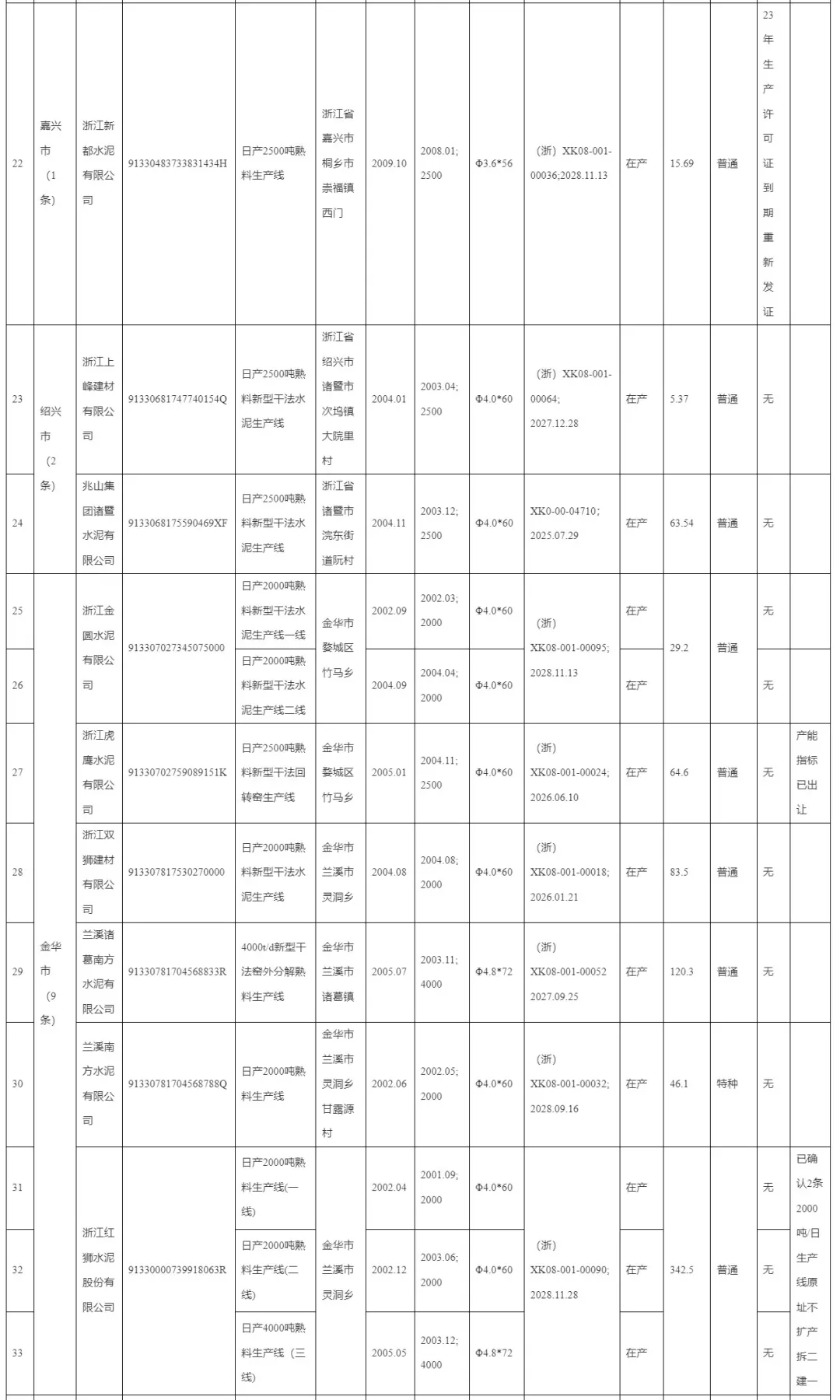 浙江省2023年度水泥熟料生產線清單